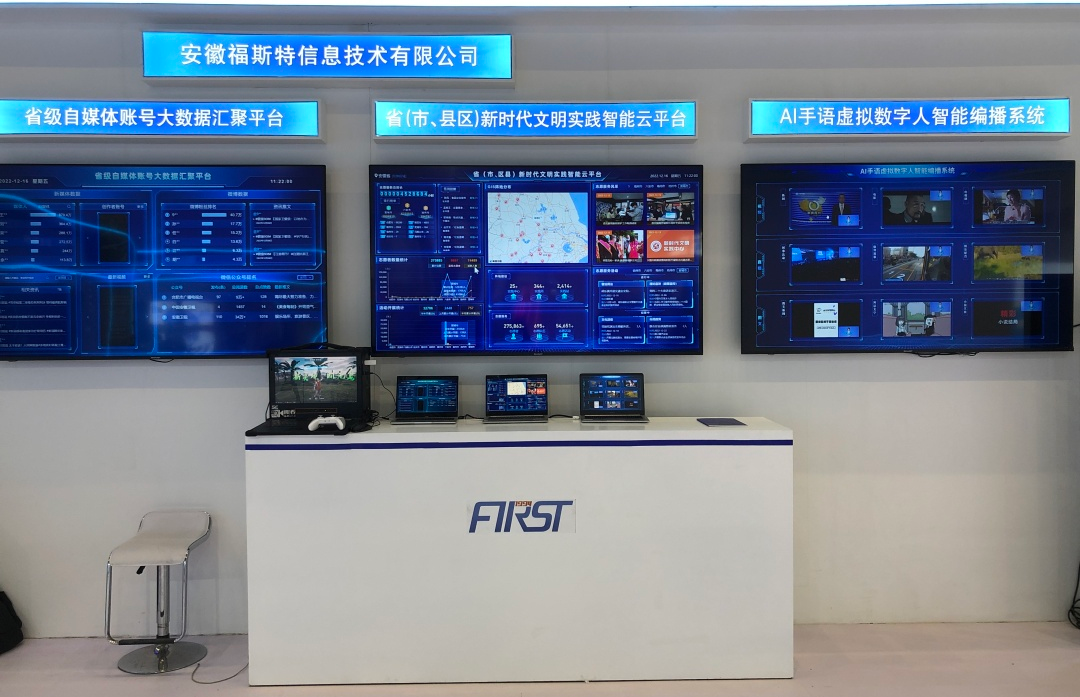 安徽福斯特信息技術有限公司此次應邀參展,以廣電媒體發(fā)展為亮點,集中展示大數據、人工智能呈現了AI-VLOG視頻智能合成系統+AI手語虛擬數字人智能編播系統+省級自媒體賬號大數據匯聚平臺+省(市、縣區(qū))新時代文明實踐智能云平臺技術。